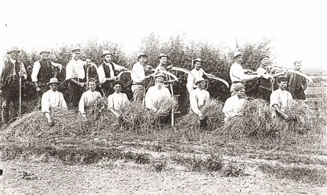 Hi My family originated from Pakenham and i have been tracing their family history I am trying to find more information about a photograph that I believe was taken in Pakenham about 1880/1881 The photograph shows 17 farmworkers holding scythes and sheaves of corn at the end of harvest, I believe that my Great, Great, Great Grandfather Amos Peck is second from the right on the back row If anyone could help identify where and when the photograph was taken or could identify others in the picture I would be very grateful